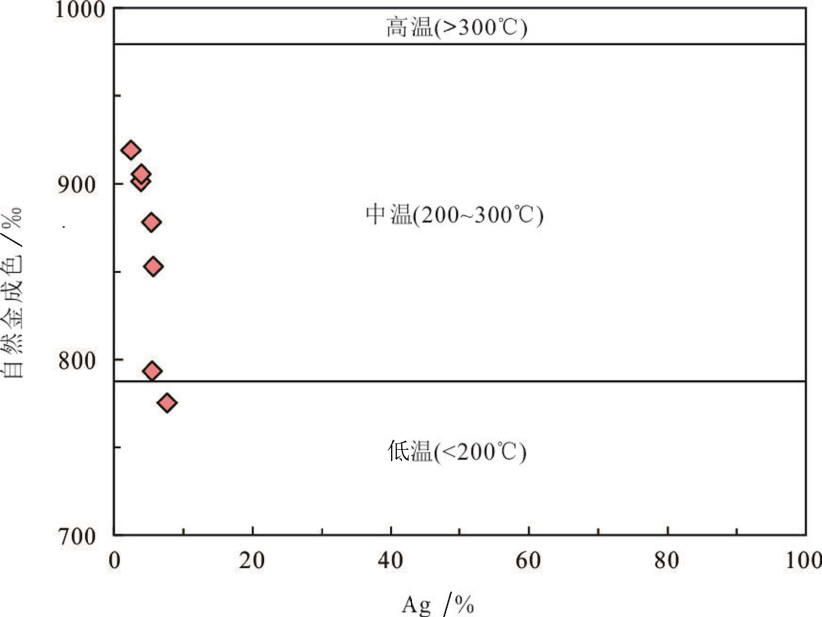 图7 新疆孔雀沟金矿床自然金成色图解(底图据卢振权等, 2000)