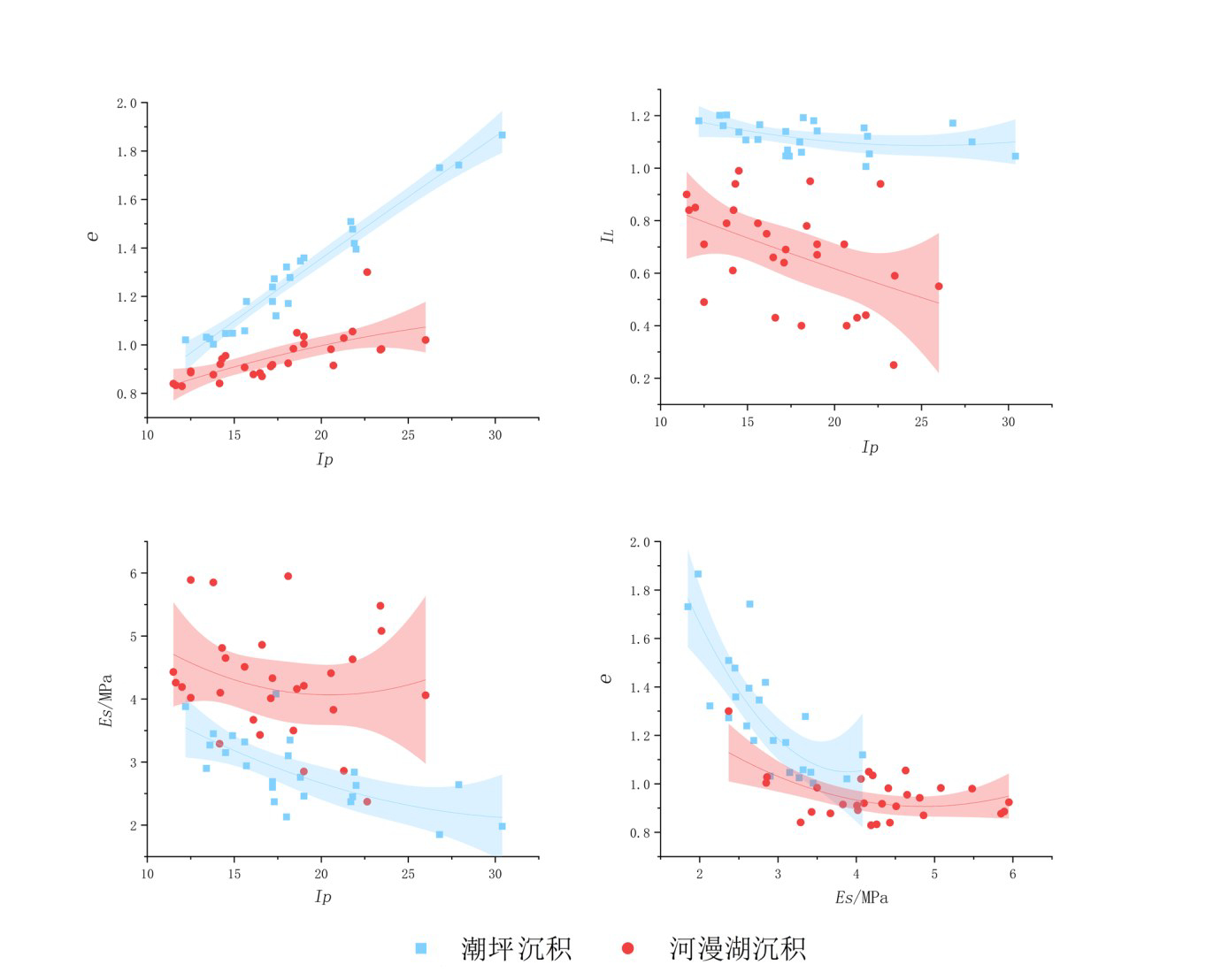 图6潮坪沉积与河漫湖沉积主要力学性质指标关系散点图