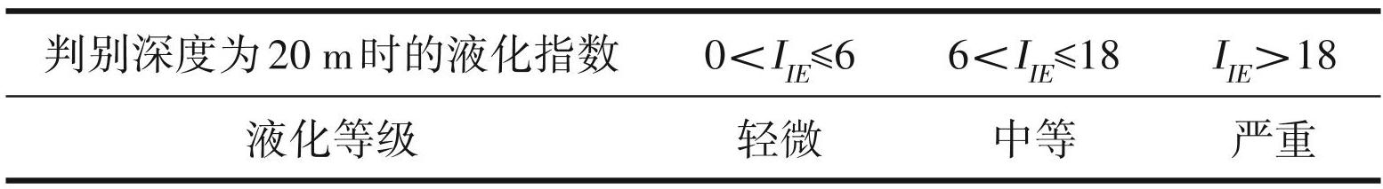 本文根据《建筑抗震设计规范(2016年版)》 (GB 50011-2010)进行液化土层的判别,研究区地震烈度为7度,地震峰值加速度0.10~0.15 g。在饱和砂土进行初步判别后,需采用标准贯入试验法判别地面以下20 m范围内土的液化情况。液化判别标准贯入锤击数临界值可按下式(1)计算,当饱和土标贯锤击数(未经杆长修正)小于或等于液化判别标贯锤击数临界值时判为液化土,最后计算液化指数(IIE)划分砂土液化等级(表2)。