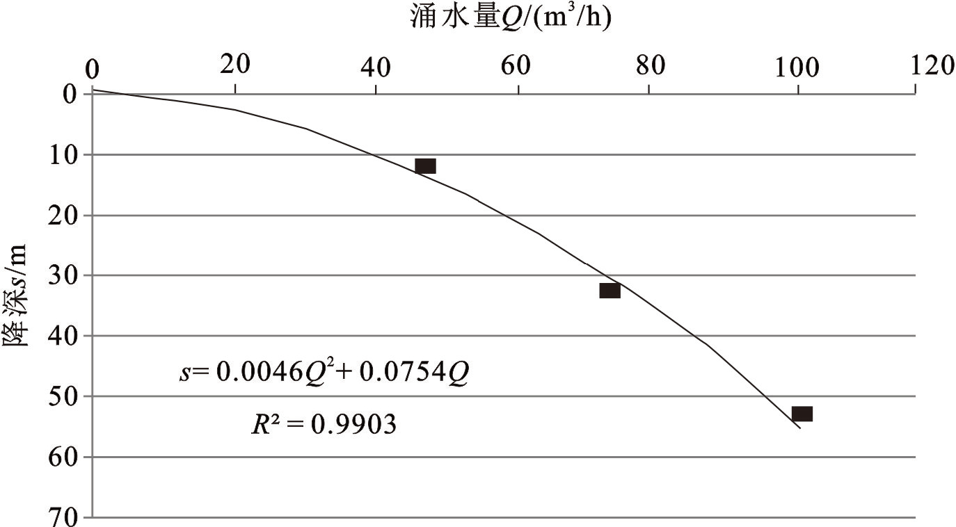 按照《地热资源地质勘查规范(GB/T11615-2010)》,采用 YQSR200-63kW 型号潜水泵,泵头下入深度110 m,测得静水位埋深33.16 m,对应液面温度35.6℃,进行了3组降压试验。第一落程(大落程 S3):历时 215 h,恢复水位 17.5 h,稳定时间 37 h,出水量 100.4 m3 /h,单位涌水量 1.89 m3 /h·m,渗透系数 2.11 m/d,导水系数 63.3 m2 /d,抽水影响半径 792.15 m。第二落程(中落程S2):历时30 h,稳定时间23 h,出水量 73.7 m3 /h,单位涌水量 2.26 m3 /h·m,渗透系数 2.26 m/d,导水系数 75.9 m2 /d,抽水影响半径 519.75 m。第三落程(小落程 S3)历时 25 h,稳定时间 20 h,出水量 47.3 m3 /h,单位涌水量 3.89 m3 /h·m,渗透系数 3.99 m/d,导水系数 119.7 m2 /d,抽水影响半径 243.24 m(表2)。取大落程试验数据计算结果,则该井单位涌水量为 1.89 m3 /h·m,渗透系数为 2.11 m/d,导水系数为63.3 m2 /d。