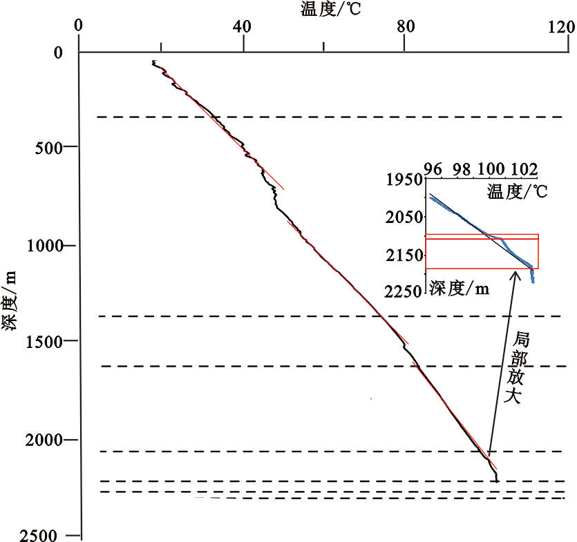 勘探井成井静止半年后每间隔 1 个月进行了 3 次连续测温,整理分析该井连续测温数据绘制了曲线图(图5),从曲线形态上看,总体上地层温度与埋深呈正向相关,而不同层段温度增长的速率由浅至深逐渐减小(图5右红色直线标示),由于地层随着埋深的增大,地层具有成岩性较好、较致密,热导率较高的特征,从而地温梯度则相对逐渐减小。另外地层温度局部还受构造断裂和地下水活动的影响,在2090 m左右寒武系地层中钻遇断裂,导致了地层温度的一个局部变化,幅度在1℃左右;但该裂隙段不是含水层,因此地温梯度变化幅度不大。因此,研究区的地层温度总体上呈现随深度近似直线增加趋势,显示了其热传输机制以热传导型为主,侧向对流的影响较小。