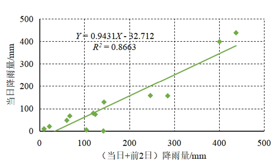 图9当日与(当日+前2日)降雨量相关性拟合图