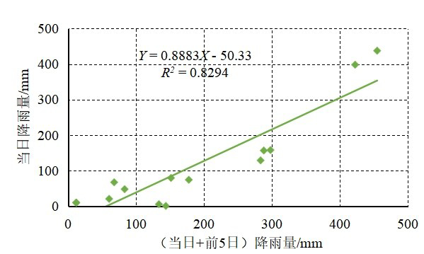 图10当日与(当日+前5日)降雨量相关性拟合图