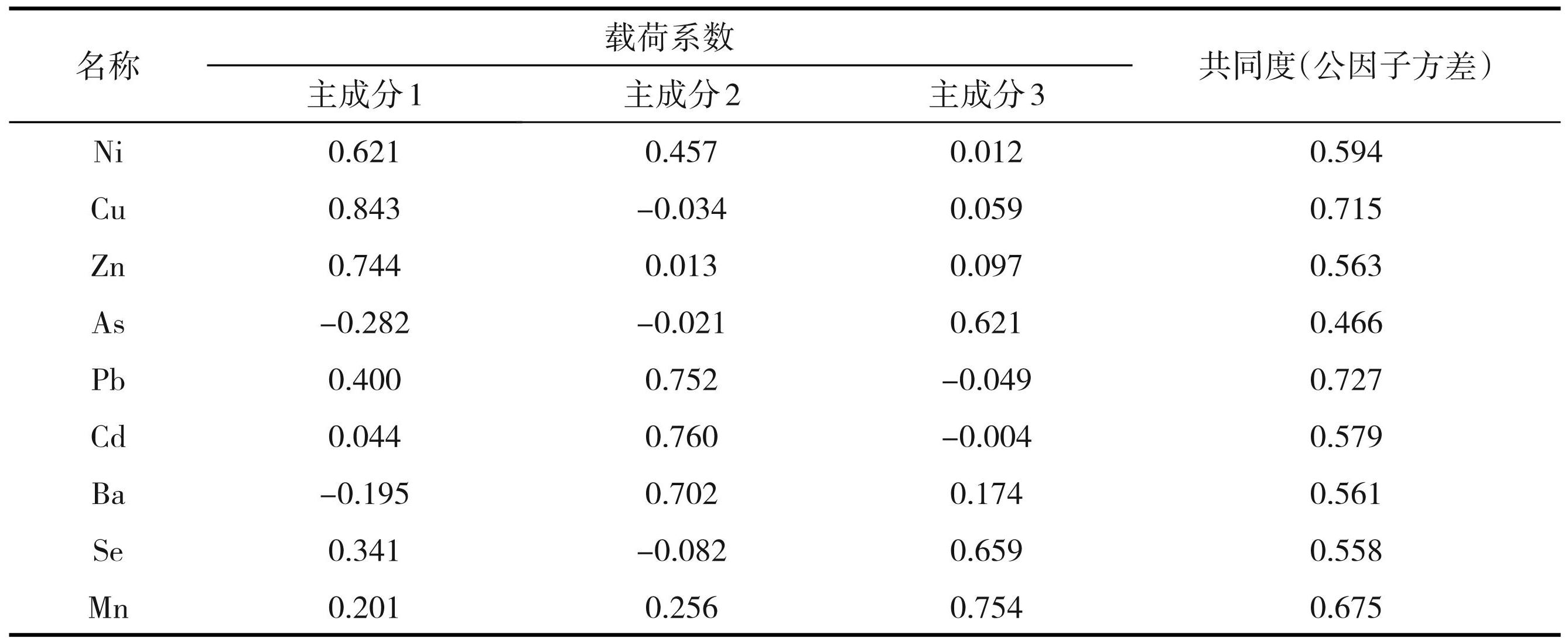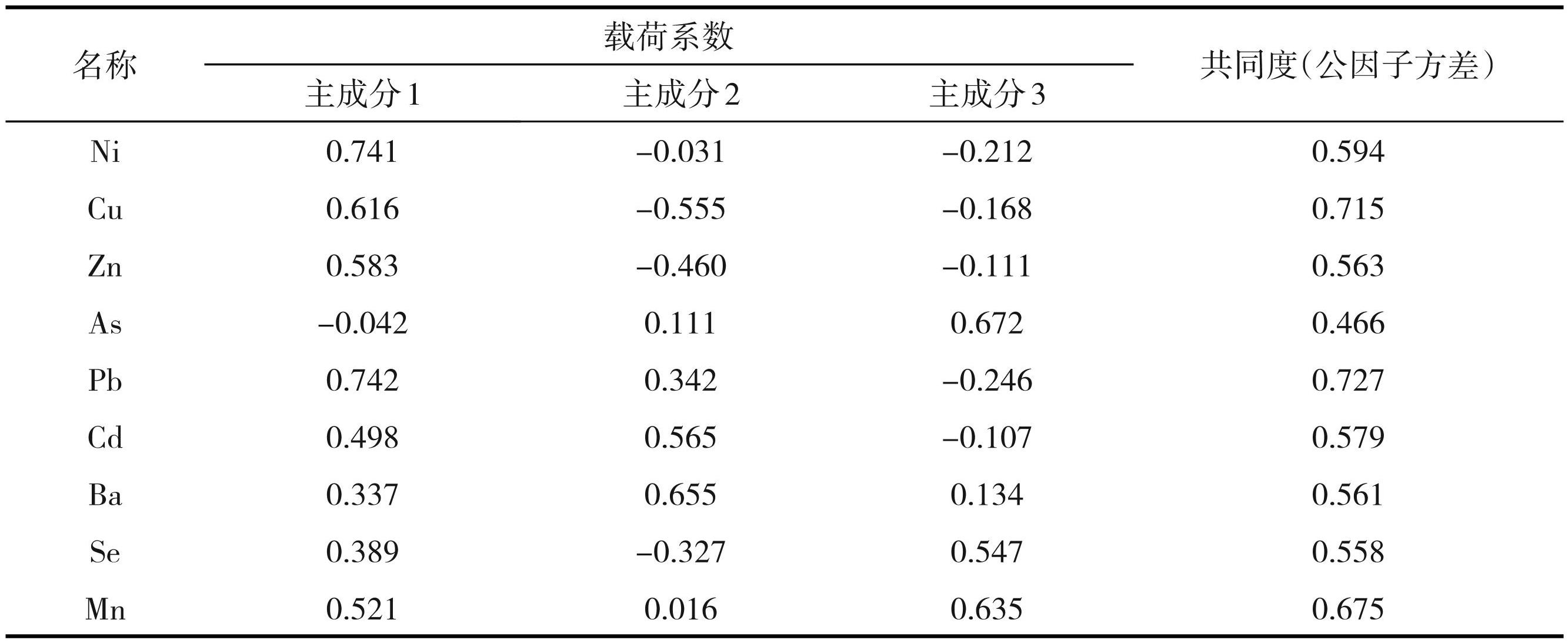 主成分 1(Ni、Cu、Zn)中 Ni、Cu、Zn 可能有着相同的来源,考虑到采样点位分布,判断主成分1主要与交通及农业有关,主成分 2(Pb、Cd、Ba)中 Pb、Cd 可能有着相同来源,由于 Pb、Cd含量大部分低于国家I类标准,可以认为Pb、Cd为自然源,Ba大部分点位符合国家 II 类标准,少部分符合 III 类标准,推测大部分为自然因素影响,少部分受排放影响,主成分2主要受自然因素和地质背景影响,主成分3(As、 Mn、Se)中Mn和Se可能有着相同的来源,Mn主要受地质背景影响,As含量可能受到农业活动和人类活动的影响,推测主成分 3 可能同时受人类活动和自然因素影响。