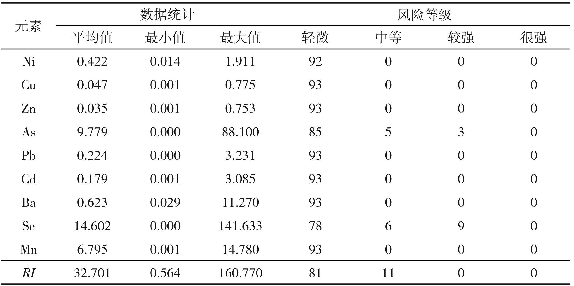 (3)从重金属生态风险指数(Er)看,大部分点位各元素风险等级均为“轻微风险”,只有 As 和 Se 的部分点位风险等级存在“中等风险”和“较强风险”。从潜在生态风险(RI)来看,只有 11.8% 的点位存在 “中等风险”,大部分点位均为“轻微风险”,研究区整体潜在生态风险较低。
