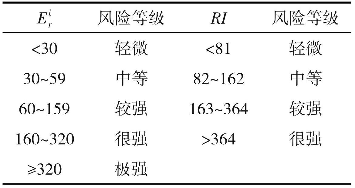 单因子和多因子评价标准如表1所示,一般综合污染指数小于或者等于 1 表示未受污染,大于 1 则表示已受污染,计算出的综合污染指数的值越大表示所受的污染越严重。