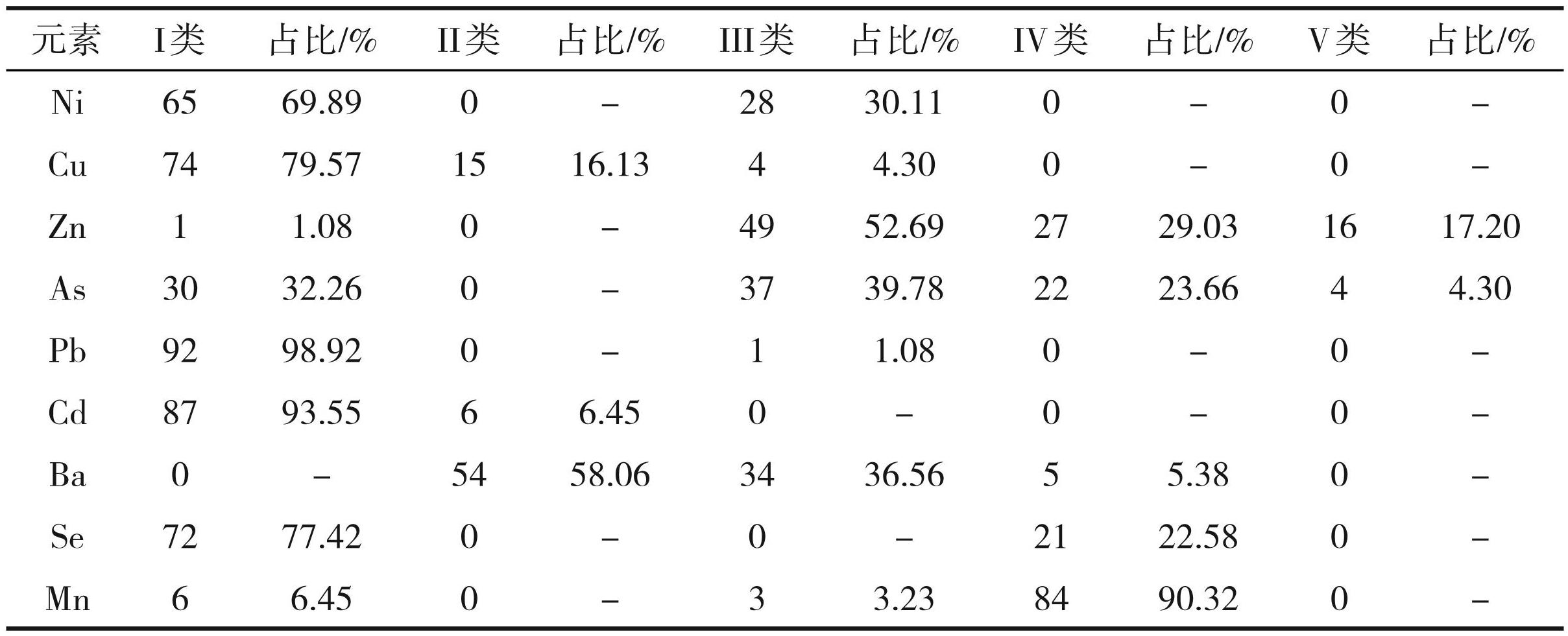 平均值从大到小顺序为:Mn>Ba>Zn>As>Se>Cu>Ni>Pb>Cd,其中,Mn 浓度是国家 III 级标准的 6.79 倍,As 浓度是国家 II 级标准的 9.77 倍,Ba 浓度是国家 II级标准的 2.18倍,其余各重金属元素浓度均符合国家I级标准。