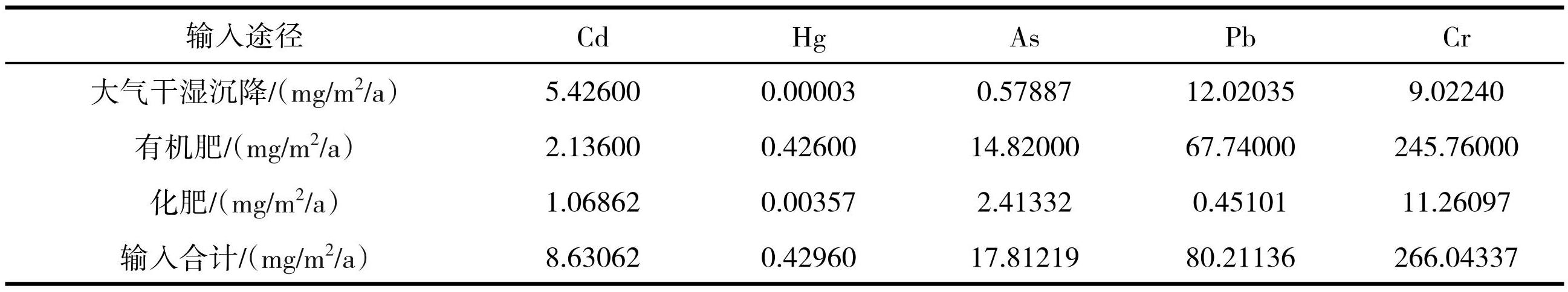 灌溉水中,5种重金属元素均未检出,其他输入途径中,Hg、As、Pb、Cr 以有机肥为主,Cd 以大气干湿沉降为主,占比达 62.87%,这与周边工业企业排放的粉尘、烟气有关。