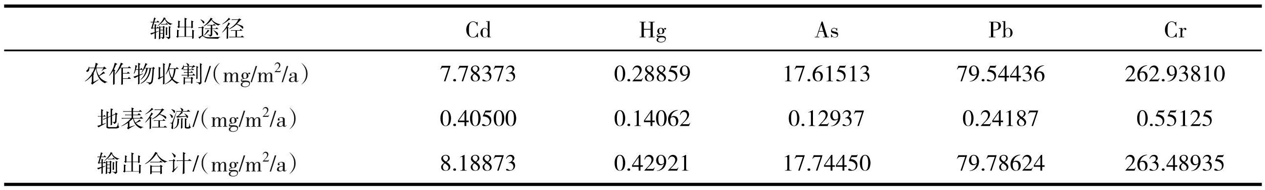 下渗水中,5种重金属元素均未检出,其他输出途径中,Cd、Hg、As、Pb、Cr的输出途径均以作物收割为主,作物收割输出占比大小关系为:Cr>Pb>As>Cd >Hg。