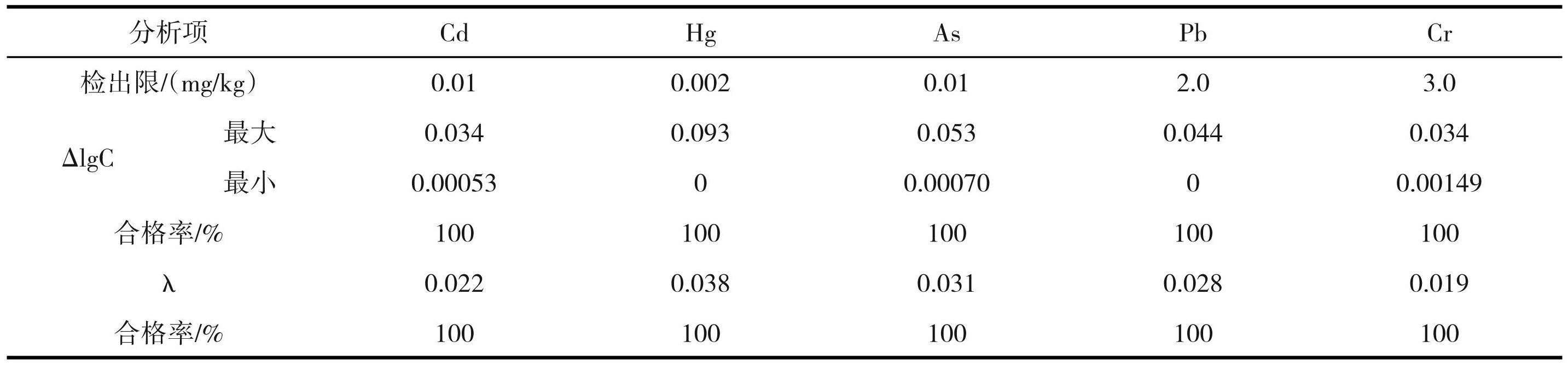 对本研究的 5 种元素数据分析的检出限,准确度和精确度情况进行了整理统计,统计结果如表1所示。从中可知,5 种元素准确度和精确度的合格率均为100%。