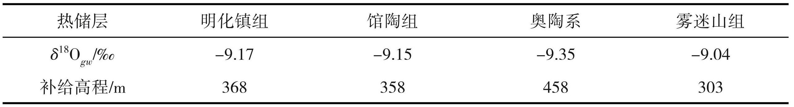 参考中国华北地区降水 δ18O 的高程效应, gradδ18OVSMOW 取-0.2‰/100 m(Liu et al.,2009)。以天津南部平原区第四系浅层地下水为参考点,其 δ18Or 值选取第四系浅层地下水水样的平均值-8.44‰(表4)。δ18Ogw值选取各热储层地热流体样的平均值及计算的各热储层的地热流体的补给高程见表5。