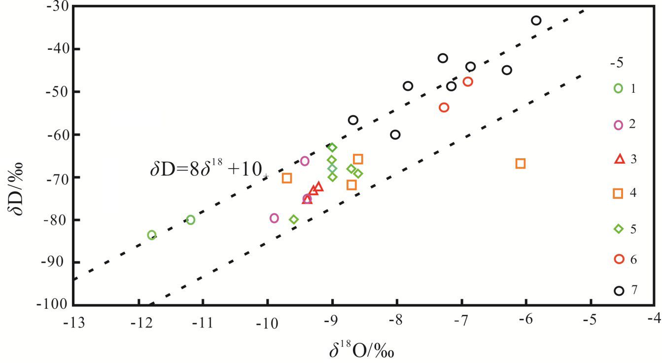 锶比值反映水岩反应的过程,δ18O 反映水岩反应的程度。其关系完整地描述了水岩反应的类型,如图8所示,研究区内地热流体的热储环境为半封闭性,存在一定水岩作用的古溶滤水。地表水样点和第四系水样点沿大气降水线分布(靳宝珍, 2015①),说明其接受大气降水补给;研究区内各热储层地热流体样点分布于大气降水线下方(图9),有轻微的δ18O漂移,呈现了补给区的特征,说明受大气降水的补给,氢氧同位素支持了大气降水补给的结论(宋美钰等,2018;景营利等,2023)。