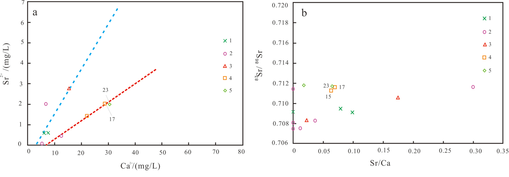 a—锶同位素与Ca2 关系图;b—(87Sr/86Sr)-(Sr/Ca)的关系样点图