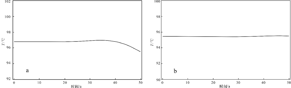 考虑地热梯级利用,回灌温度设定为 25℃,计算时长为50 a,时步为30 d。经模型模拟计算,开采井在50 a内均不会产生热突破。