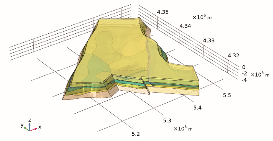 在 COMSOL 中,综合考虑计算精度与计算效率之间的平衡,地热井及周围区域的网格精细化,最大单元尺寸 50 m,最小单元尺寸 5 m。雾迷山组储层网格尺寸为细化,最大单元尺寸 3140 m,最小单元尺寸 393 m。其余网格尺寸为常规,最大单元尺寸6390 m,最小单元尺寸798 m;模型共包含约30万个四面体单元,地热井由一维线单元代表(图4)。