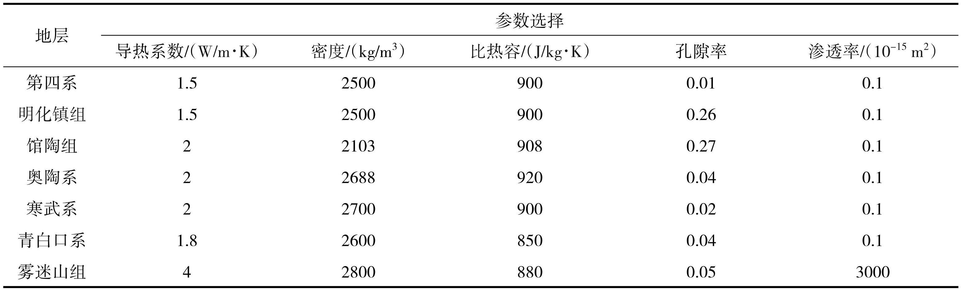 根据相关回灌试验数据及收集到的针对本研究区域及邻近区域的文献资料等所记录的地层参数数据,结合抽水试验结果及热突破预期,得出研究区域地层的相关参数(表1)。结合文献资料中的记录和模拟的具体情况,在合理的范围内对部分参数进行了选择及简化,将盖层设置为低渗地层。