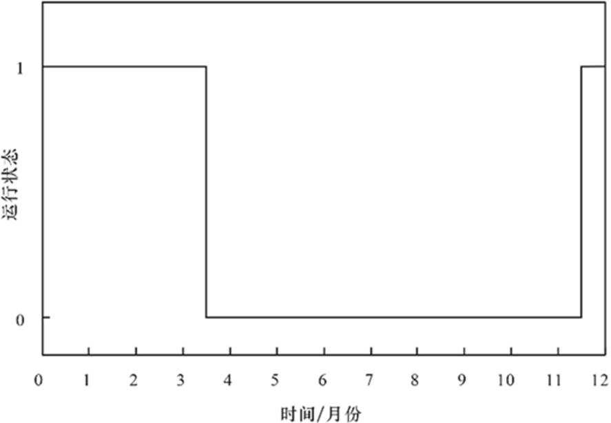 区内地表水回灌井,仅在丰水期回灌;其余地热井只在供暖季运行(11月15日—3月15日),其时间周期函数(按累计开采月数算)如图5所示(0表示停采,1表示开采),时间步长为30 d。