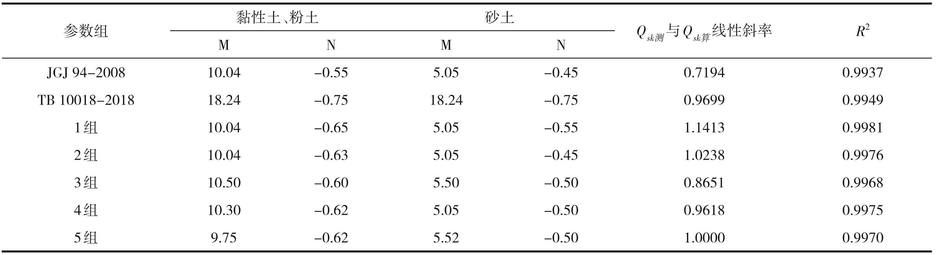 参照《建筑桩基技术规范(JGJ 94-2008)》有关公式,桩侧阻力综合修正系数βi也采取βi = M( fsi)N 的形式来表达,将黏性土、粉土作为一类,砂土作为一类,分别确定不同的M、N参数组合。按照前述研究思路和方法,先采用《建筑桩基技术规范(JGJ 94-2008)》中双桥静力触探估算预制桩单桩竖向极限承载力方法,以及《铁路工程地质原位测试规程(TB 10018-2018)》中双桥静力触探估算钻孔灌注桩单桩竖向极限承载力标准值公式和参数计算相应桩型的承载力,作为对比;再拟定不同的 M、N 参数组合对表1所列静探孔数据资料进行相应桩型的承载力计算,其中后注浆灌注桩的竖向增强段侧阻力增强系数 βsi 作为叠加系数,按照《建筑桩基技术规范 (JGJ 94-2008)》取中值并参与计算。将每一组M、N 参数计算得到的总侧阻力Qsk算与根据静载试验确定的侧阻力 Qsk测进行线性回归分析,按照两者线性关系斜率为 1、截距为 0的目标,不断调整 M、N参数再次计算和分析;直至得到Qsk测 = 1∙Qsk算线性关系时,认为此时 M、N 参数最优。试算选取的典型 M、N 参数组合及拟合结果详见表2,并参见图1。