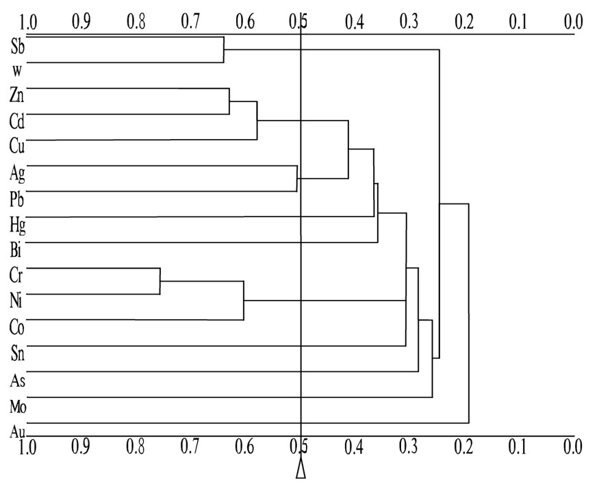 从含矿地质单元样品中 16 种元素进行 R 型聚类分析和因子分析(王召林等,2018①),大致存在 4 类组合,分别是:WSb 组合,与复杂地质作用有关,总体上反映酸性岩浆热液活动特征;ZnCdCu 组合,反映了基性火山岩高背景组合特征;AgPb 组合,反映了酸性火山岩组合特征;CrCoNi 组合,与深大断裂关系较大。主要成矿元素 Mo、Au 与其他元素相关性较差,反映了相对独立的成矿作用,Mo 可能与隐伏斑岩活动有关,Au则与中酸性岩浆侵入期后中低温热液活动关系较大(图3)。