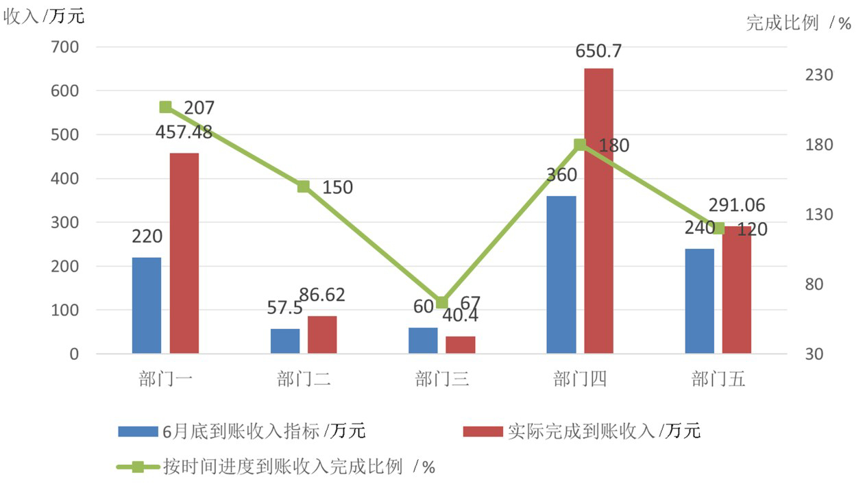 根据表2所示,部门一1—6月到账收入指标E1 为 220 万元,实际到账收入 F1 为 457.48 万元,按时间进度到账收入完成比例G1为207.95%,1—6月底内部贡献指标I1为91.5万元,实际完成内部贡献J1 为 88.12万元,按时间进度内部贡献完成比例 K1为 96.31%,1—6 月经济指标完成率 L1 为 G1*20%+K1* 80%=118.63%(L1),绩效发放比例按照表格 1 所示,按 120%发放。同样的方法计算得出部门二经济指标完成率为 110.13%,绩效发放比例为 120%;部门三经济指标完成率为 106.8%,绩效发放比例为 110%;部门四经济指标完成率为 82.8%,绩效发放比例为 90%;部门五经济指标完成率为 75.72%,绩效发放比例为80%。其中各部门截止6月底到账收入指标、实际完成指标、到账指标完成率对比图如图2,6月底内部贡献指标、实际完成指标、按时间进度完成率指标对比图如图3。