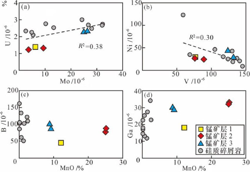 样品中氧化还原敏感微量金属元素(Mo、U、V 和 Ni)含量整体呈现出较大的变化范围。其中,10 件硅质碎屑岩样品 Mo 含量变化于 2.4×10-6~32.2× 10-6;U 含量变化于 2.1×10-6~3.0×10-6;V 含量变化于 59.1×10-6~145.0×10-6,Ni 含量变化于 8.9×10-6~123.0×10-6 (表1)。5件锰矿样品的 Mo、U、V和 Ni含量分别变化于 6.2×10-6~26.4×10-6,1.2×10-6~2.4× 10-6,76.1×10-6~132.0×10-6 和 24.2×10-6~41.8×10-6。总体而言,硅质碎屑岩样品与锰矿层样品在这些微量金属元素的含量上未显示出显著差异,但是,相较于锰矿层3,锰矿层1和2样品具有更低的金属元素含量(图3a~b)。