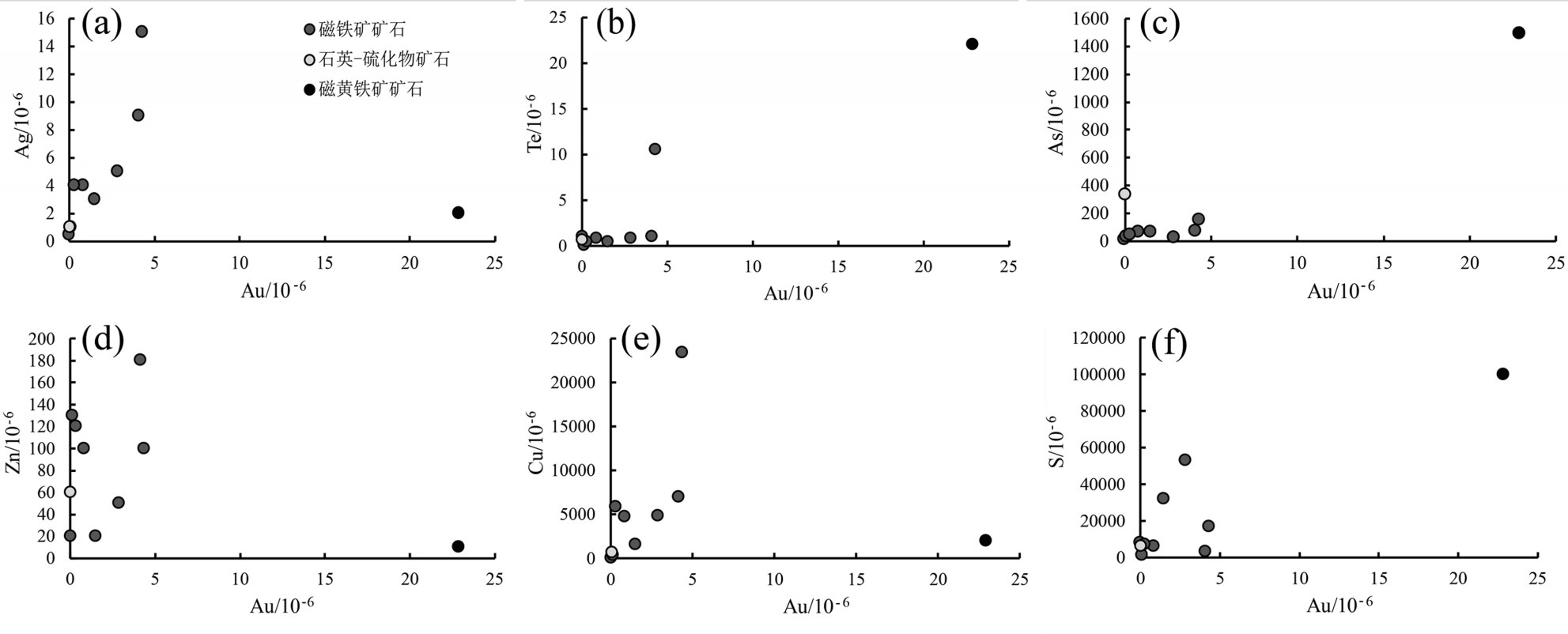 在金和相关元素的散点图中,可以看出在含磁铁矿金矿石中金和银有一定的正相关性(图5a),也印证之前认为的金是以银金矿形式赋存的;金矿石中金和锌、铜也具有一定的正相关性(图5d~e);除此之外砷、硫对金的成矿也具有一定影响(图5c、f)。特别注意的是,碲在金的沉淀过程中具有重要作用,从散点图中可以看出碲与金的相关性也比较好(图5b)。