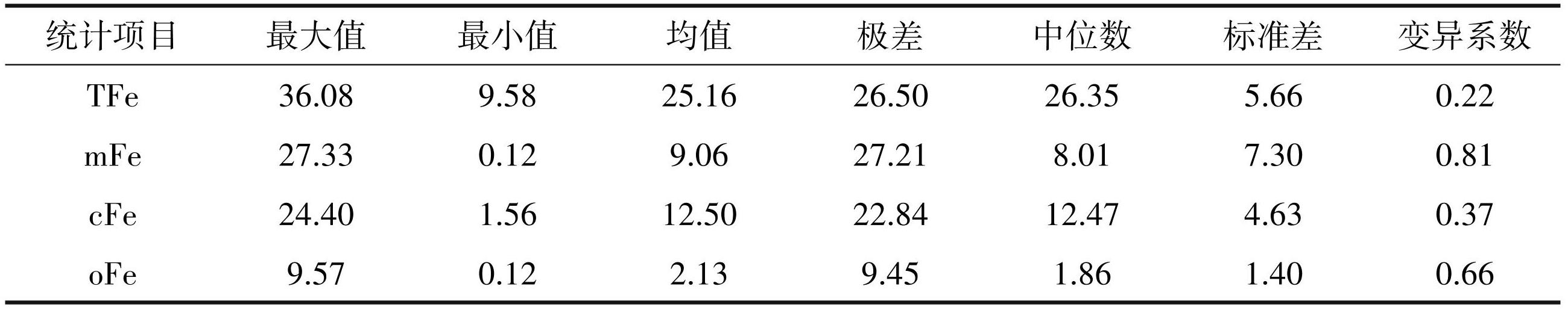 依据物相分析结果,将所有样品数据组成一个整体,依次对样品数量、最大值、最小值、均值、极差、中位数、标准差和变异系数共7项进行了分类统计(表2)。假设以式(1)表示样品结果均值与中位数的偏离程度,则 TFe、mFe、cFe、oFe 这 4 种指标的偏离程度依次为 4.73%、11.59%、0.24%,12.68%,即 4 种指标的偏离度由大到小依次为 oFe、mFe、TFe、 cFe,其中 oFe 的中位数与均值的偏离程度最大,约为12.68%,故可认为样品的均值可以代表本区各含铁组分的特征。