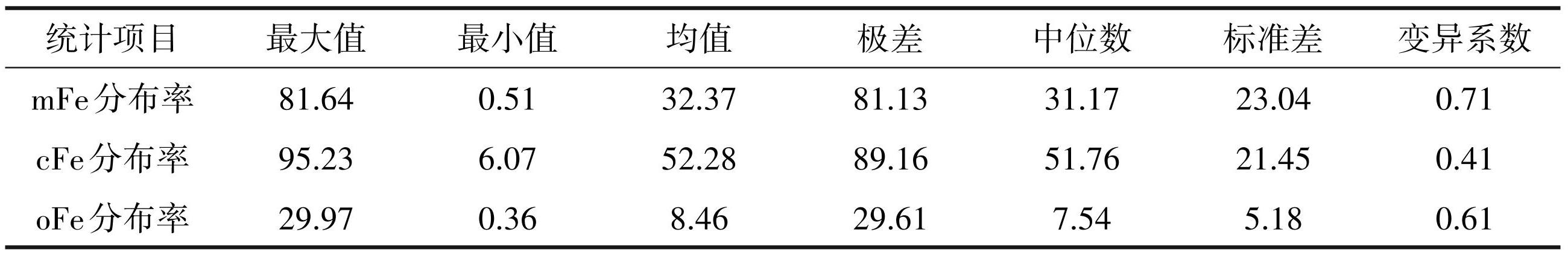 各含铁组分占全铁的比重称为分布率(胡义明,2011;甘德清等,2015;张琦等,2019),同理,对样品的分布率进行了统计(表3),cFe、mFe、oFe的分布率依次为52.28%,32.37%,8.46%。