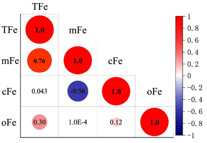 由表2、表3可以看出,分布率由大到小依次为 cFe、mFe、oFe,即 cFe和 mFe是影响 TFe含量变化的主要含铁组分。为了探索各组分之间的相关性关系,本文选择皮尔逊相关系数进行分析。分析发现了两对相关性密切的规律,一是 mFe 与 cFe 的相关性系数为-0.56,二是 mFe 与 TFe 的相关性系数为 0.76(图3)。