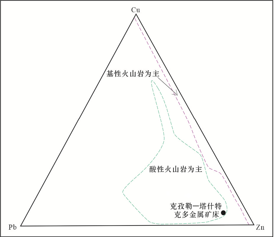 火山成因块状硫化物(VMS)矿床为硫化物在海底或近海底处沉淀堆积以及时空分布和成因与同期火山活动紧密相关的一类层控矿床(Franklin et al.,2005)。关于VMS矿床的进一步分类,不同的专家学者从不同的角度,如矿石成分(Franklin et al., 1981)、地质背景(Eremin et al.,2000)、含矿岩系 (Franklin et al.,2005)、矿区与矿床同时代的岩石地层(Franklin et al.,2005)对其进行了分类。克孜勒—塔什特克 VMS 锌多金属矿床含矿围岩为下寒武统图玛特泰加地层组玄武岩-流纹质凝灰岩双峰式火山岩,矿体则定位于流纹质凝灰岩内,含矿围岩与蛇绿岩套型基性火山岩、铁镁质-硅屑岩、双峰式硅屑岩存在明显差别,而与双峰式酸性火山岩类似。克孜勒—塔什特克 VMS 锌多金属矿床矿化元素具有一定含量的铅、相对较低的铜和富锌的特征,与典型的双峰式酸性火山岩性相比,克孜勒— 塔什特克VMS锌多金属矿床铅含量相对较低,与阿尔泰阿舍勒、东天山卡拉塔格VMS铜锌矿床几乎不含铅的特征存在显著差别(毛启贵等,2016;陈曦等,2018),在 Cu-Pb-Zn 成分图解中(图9),落入主体酸性火山岩的边界附近,表明矿床含矿围岩虽属双峰式酸性火山岩,但酸性火山岩组分并未显著占优,与矿床来自酸性火山岩的铅含量相对较低一致。以上总体表明克孜勒—塔什特克 VMS 锌多金属矿床为铅含量相对较低的双峰式酸性火山岩型 VMS型矿床。