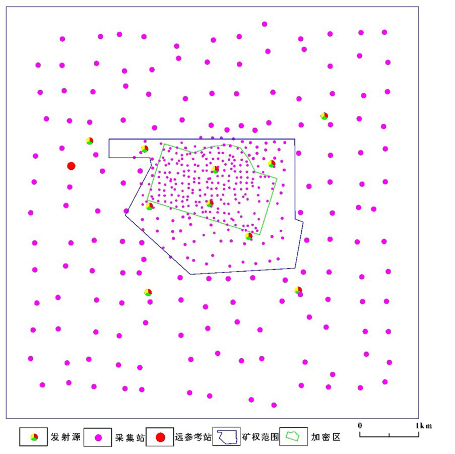 龙桥铁矿前期的地质物探工作,积累了大量的钻孔、物性资料,为选择测量参数,研究矿区内的三维电性结构,探测深部地层、断裂、岩体等目标提供了基础信息、奠定了勘探前提。本次数据采集使用 3 台功率为 20 kW 的 HOLO-EM-T 型发射源和 HOLO-EM-V3型采集站,布置一个全息电磁法勘探阵列,阵列长宽6 km×6 km,设计物理点数430个,点距 100~500 m,测量采用三维观测系统(图7)。中心区按照相对规则的测网每次布设64个接收站和9 个发射场源,每个测点接收互相正交的两个水平电场(Ex,Ey)。