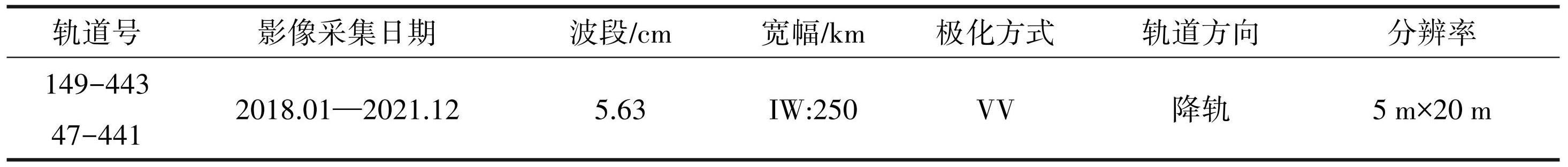 本文选择欧洲空间局(ESA)发射的Sentinel-1B 卫星,获取了覆盖研究区域分别为 90 景和 87 景单视复数影像(SLC)作为实验数据,数据范围如图2所示。表1显示的是所用 SAR 影像的基本参数情况,其中获取了 2018 年 1 月—2021 年 12 月期间的 2 个轨道的影像数据。数据极化方式为 VV,轨道方向为降轨,分辨率为 5 m×20 m。此外,本文使用的数字高程模型(DEM)数据为美国宇航局(NASA)公开的SRTM数据,其分辨率为30 m×30 m。
