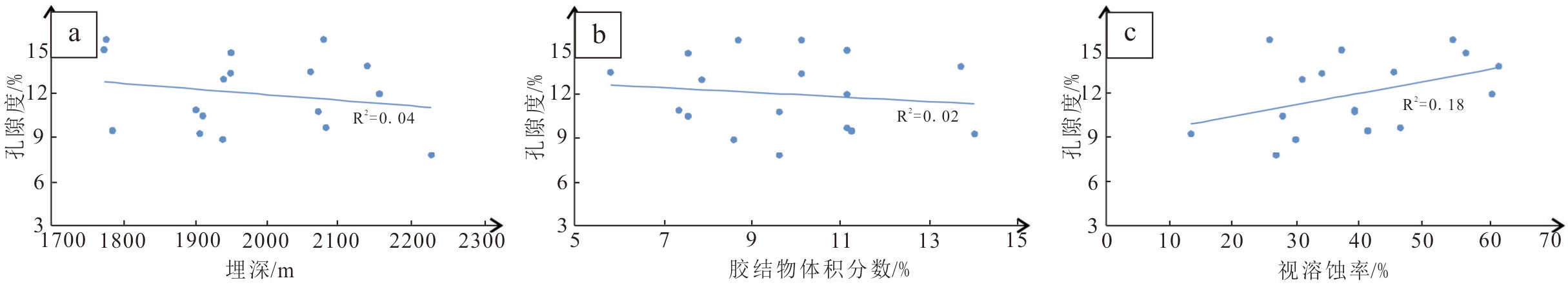 a—埋深与孔隙度的相关性;b—胶结物与孔隙度的相关性;c—视溶蚀率与孔隙度的相关性