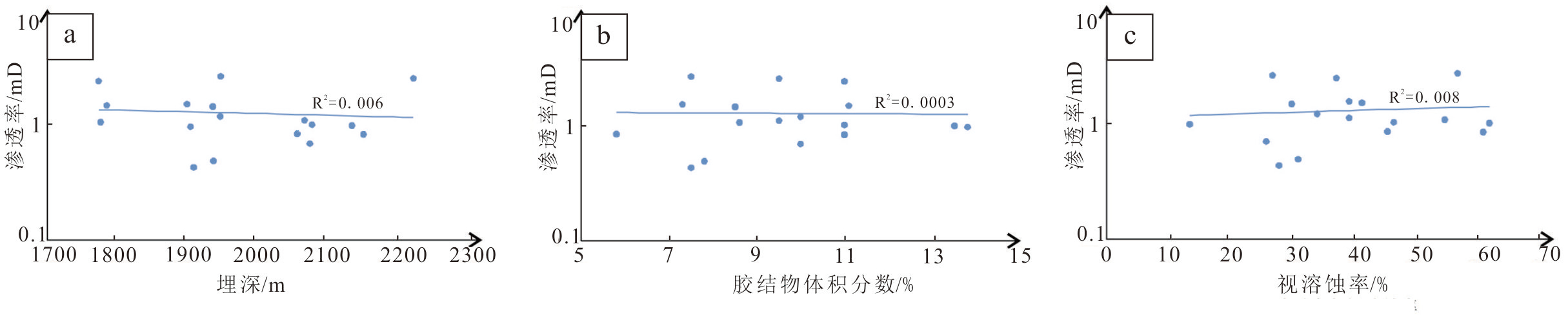 a—埋深与渗透率的相关性;b—胶结物与渗透率的相关性;c—视溶蚀率与渗透率的相关性