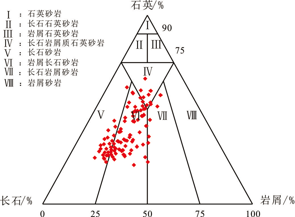 通过对华庆地区长 63小层 99 块样品进行薄片观察与鉴定,并进行绘制三角分类图(图2),研究区主要发育岩屑长石砂岩和长石砂岩,长石岩屑质石英砂岩和长石岩屑砂岩也少量发育。