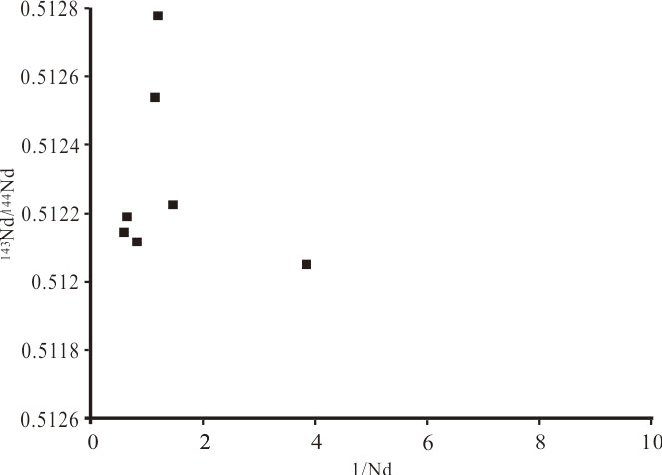 图8龙头沟金矿床1/Nd与143Nd/144Nd关系图