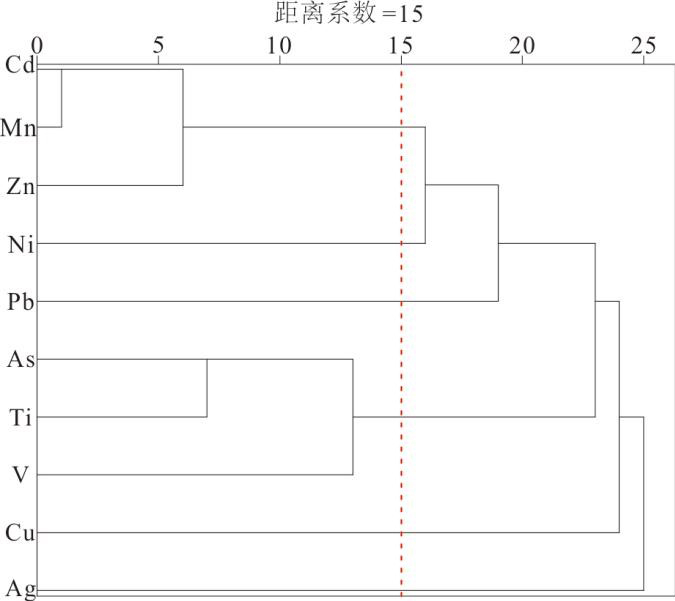 R 型聚类分析是对变量进行的分类处理,其特点是可以了解变量之间,以及变量组合之间的亲疏程度(Nogueira and Munita,2020)。谱系图(图8)中可见,当阈值取 15 时,可将 10 种元素划分为 2 类元素组合及4个独立元素,元素组合即:①As、Ti、V,② Cd、Zn、Mn;独立元素为Cu、Ag、Ni、Pb。
