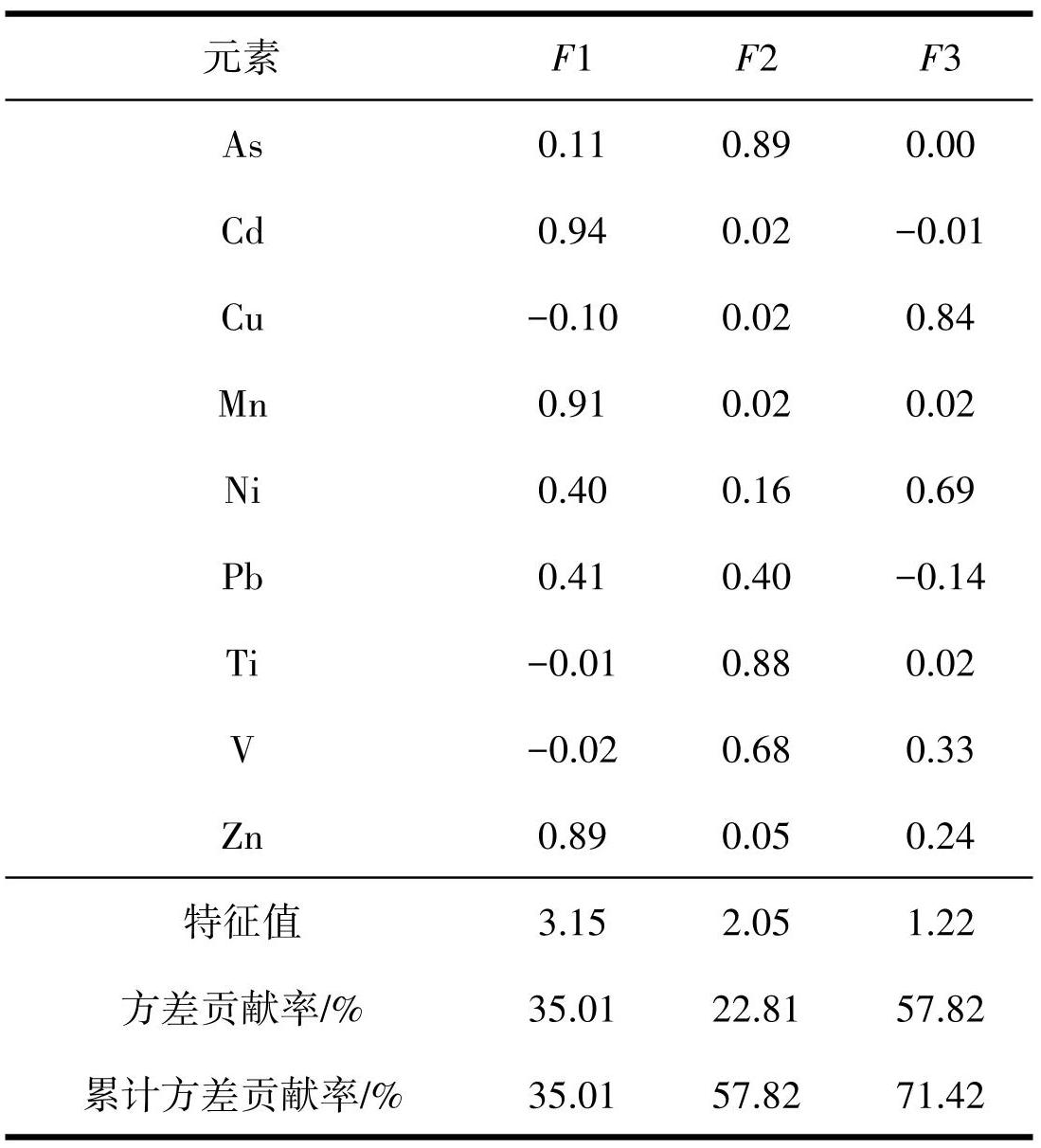 通过元素的相关性矩阵(表3)可知:Cd 和 Mn (0.92)相关系数大于 0.80,为极强相关;As 和 Ti (0.70)、Ni 和 Zn(0.63)、Cd 和 Zn(0.77)、Mn 和 Zn (0.70)的相关系数均大于0.60,表现出强相关性,从成因方面来分析,相关性较好的元素可能在成因和来源上有一定的关联。As 和 Pb(0.45)、V 和 As (0.41)、V和Ti(0.54)的相关系数介于0.40~0.60,为中等程度相关。值得注意的是元素 Ag 与其它元素相关系数均小于0.2,表现为不相关。