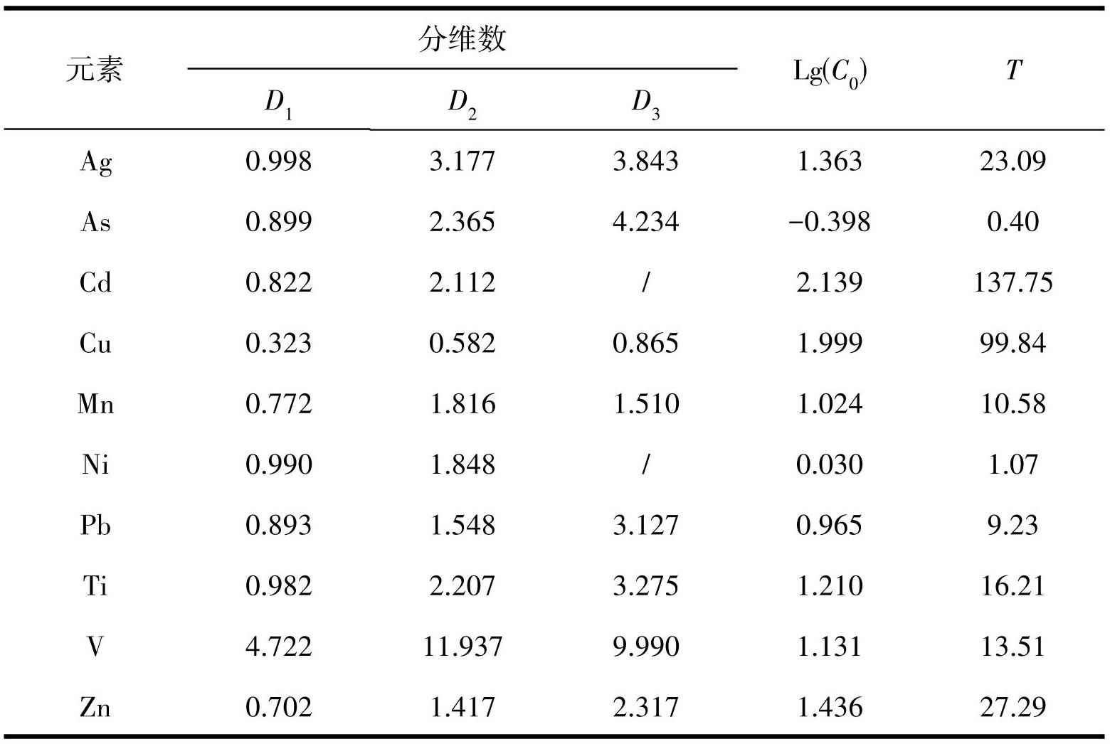 一般来讲,分维数 D 反映了元素含量在空间分布上的丛集程度和不均匀程度,D值越小,表明元素的丛集程度越高。由元素含量-频数分形图(图7) 可知,D1值普遍小于 1,表明元素差异性较小,在该区呈低背景值分布,而V元素D1大于1,表明元素在该区背景值相对较高;以分维系数 D2=2 为界,Cu、 Mn、Ni、Pb、Zn 元素均小于 2,表明这些元素在研究区空间分布差异大,丛集程度高,呈现多标度分型特征,经历了两次及以上的次生富集作用。Ag、As、 Cd、V、Ti 元素分维系数 D2均大于 2,说明这些元素空间分布差异小。