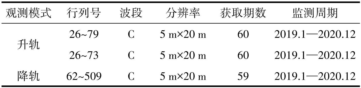 笔者共收集 2019 年 1 月 —2020 年 12 月共 60 期,合计 179 景数据用于地表形变研究。每期次包含:升轨数据 2 景(景号 26~79、26~73),降轨数据 1 景(景号62~509)(表1)。