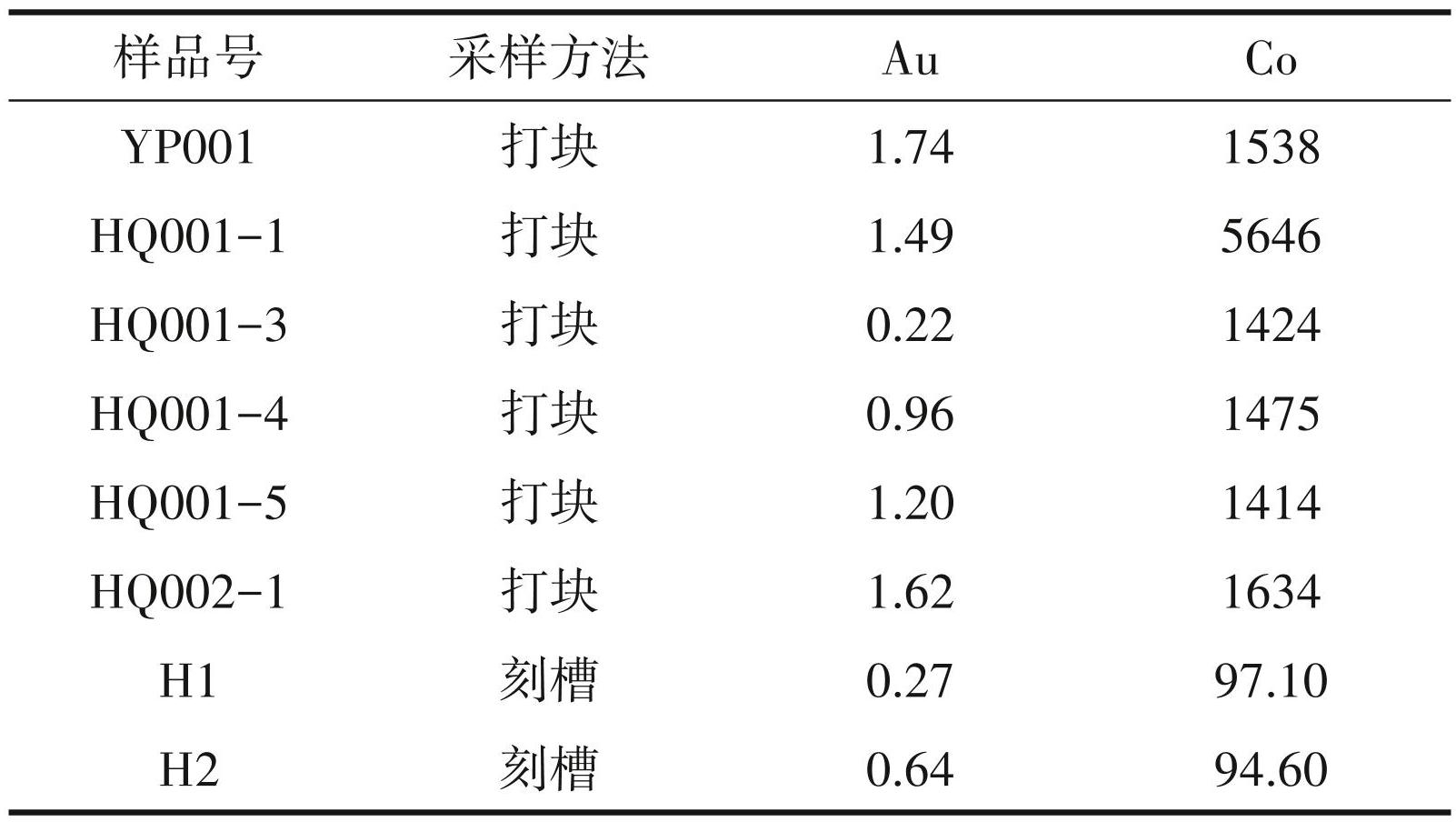 (2)打块和刻槽样品化学分析结果显示(表1), Au 0.22×10-6~1.74×10-6 (平均 1.02×10-6)、Co 94.60× 10-6~5646×10-6(平均 1665×10-6),其中刻槽样品 Au 品位0.27×10-6~0.64×10-6,Co品位94.60×10-6~97.10× 10-6。通常 Au 与 Co 的化学性质不同,源区不同,因此一般不共生,形成 Au-Co组合的矿床在国内外罕见,已有资料显示,世界范围内仅有加拿大 Werner Lake Au-Cu-Co 矿床、澳大利亚 Carlow Castle Au-Cu-Co 矿床、新疆蕴都卡拉 Au-Cu-Co 矿床、青海东昆仑驼路沟 Au-Co 矿床、新疆昭苏卡拉盖雷 Au-Cu-Co矿床等少数几个。化学分析结果显示出花桥一带 Au-Co 具空间共存的特点,为研究少见的 Au-Co组合矿床提供了较为珍贵和关键的新实例载体,其形成机制值得深入探索。