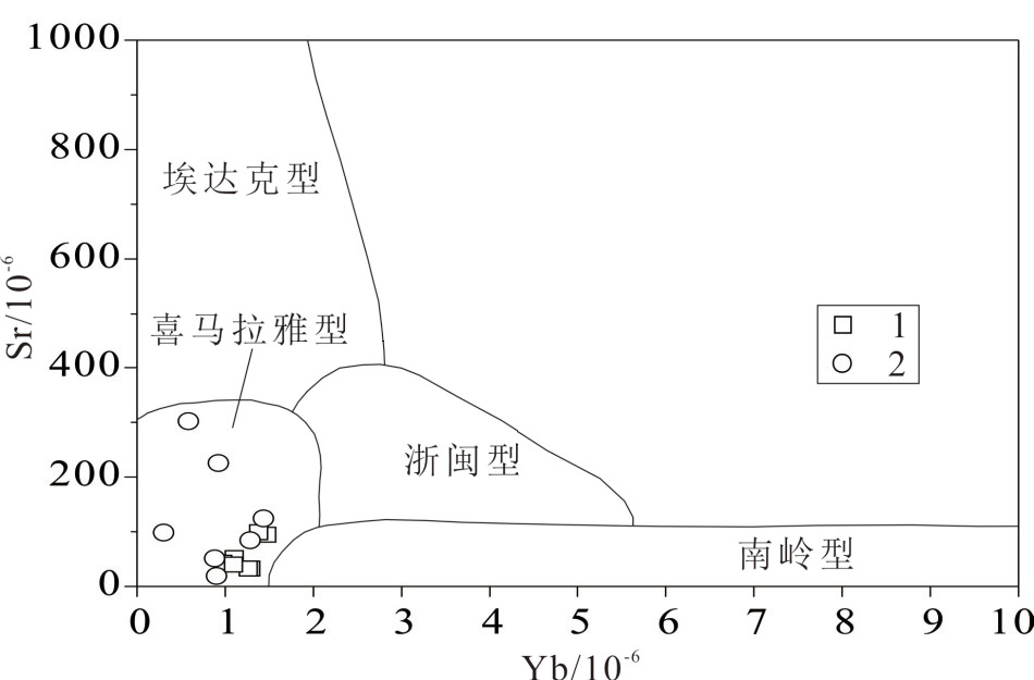 蒿坪沟花岗斑岩在哈克图解和蛛网图中分别显示了 CaO 负相关关系和 Sr负异常谷及 Eu 弱负异常(图4、图6),这很容易归因于斜长石的结晶分异。事实上,斜长石的结晶分异会引起残余岩浆体系成分系统的变化,导致全岩主量元素含量产生联动性的改变,然而它的 Al2O3、Na2O 和 K2O 没有显示出斜长石结晶分异所需的协变趋势(图4),如 Al2O3和 CaO 投点的同步降低趋势,说明蒿坪沟花岗斑岩的岩浆演化中没有经历明显的斜长石结晶分异作用。它的 LaN-(La/Yb)N投点趋势(图6b)表明岩石源区部分熔融过程控制其成分变异(Henderson,1984),源区岩石存在斜长石残留导致了蒿坪沟花岗斑岩的 Sr、Eu负异常。