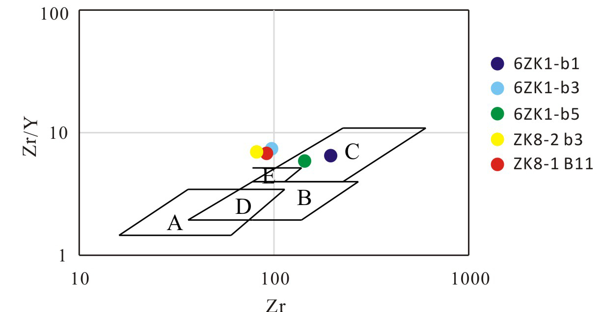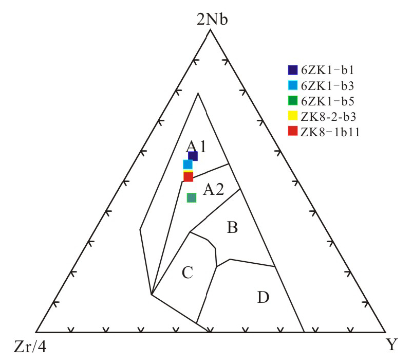 稀土元素分析数据见表1。岩石球粒陨石标准化稀土分配图表现为右倾型(图8a),显示其稀土分异程度相当,具有同源岩浆特征。稀土元素总量变化范围较大,稀土总量 ∑ REE 值为 84.82×10-6~233.06×10-6,平均值141.2×10-6,轻稀土总量∑LREE 值为 73.94×10-6~206.08×10-6。 ∑ HREE+Y 的值为 10.88×10-6~26.98×10-6,∑LREE/(∑HREE+Y)的值为 6.71×10-6~7.64×10-6,表现为轻稀土富集型,轻重稀土分馏作用明显。(La/Yb)N 值为 1.82~2.24,(La/ Sm)N值7.47~9.3,轻稀土分异程度较低,(Gd/Yb)N值为2.45~3.17,重稀土分异程度较低。δEu值为1.13~1.33,均>1.0,显示出为 Eu 正异常,而 Eu 的异常通常被用来指示岩浆的氧化状态(鲁迪,2021),正异常表明岩浆的氧化状态为氧化条件。
