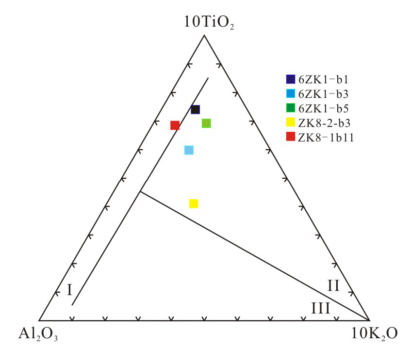 在探讨富宁地区早期基性岩的构造环境时,Zr-(Zr/Y)图解(图9)被证明是一种有效的区分手段,能够辨别大洋岛弧、洋中脊玄武岩(MORB)以及板内玄武岩(WPB)的类型。在本研究中,多数样品的地球化学数据落在WPB的界定范围内,表明其与板内玄武岩的特征相符。(Zr/4)-2Nb-Y 图解(图10) 中,这些样品主要分布在 A2区域,即板内拉斑玄武岩的范畴内,进一步验证了基性岩的板内玄武岩属性。10TiO2-Al2O3-10K2O图解(图11)显示样品点主要集中在大陆玄武岩、安山岩区域,与前述图解的结果相一致,共同指示毛姐山金矿矿区在当时可能处于一个拉张的大陆板内构造环境。近期的研究成果支持这一观点,王涛等(2021)提出该地区的岩浆活动可能与古特提斯洋的演化过程密切相关,其地球化学特征与大陆板内构造环境的特征相吻合。韩欢欢(2021)对富宁地区辉绿岩的研究(通过斜锆石 LA-ICP-MS 测年得到的(255.6±5) Ma 的年龄数据)也与笔者的发现相一致。区域上的其他研究,如张晓静和肖加飞(2014)对桂西北地区辉绿岩的研究,同样支持了富宁地区该时期拉张构造环境的观点。