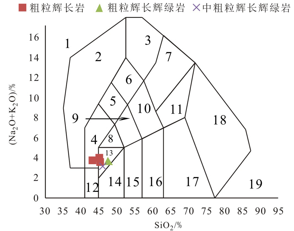 1—霓方钠岩/磷霞岩/粗白榴岩;2—副长深成岩;3—似长石正长岩; 4—似长石辉长岩;5—似长石二长闪长岩;6—似长石二长正长岩; 7—正长岩;8—二长辉长岩;9—二长闪长岩;10—二长岩;11—石英二长岩;12—橄榄辉长岩;13—碱性辉长岩;14—非碱性辉长岩;15— 辉长闪长岩;16—闪长岩;17—花岗闪长岩;18—花岗岩;19—硅英岩