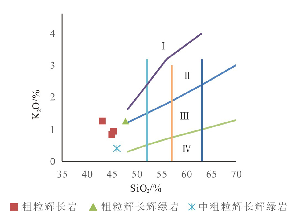 Ⅰ—钾玄岩系列;Ⅱ—高钾钙碱性系列;Ⅲ—钙碱性系列;Ⅳ—低钾系列