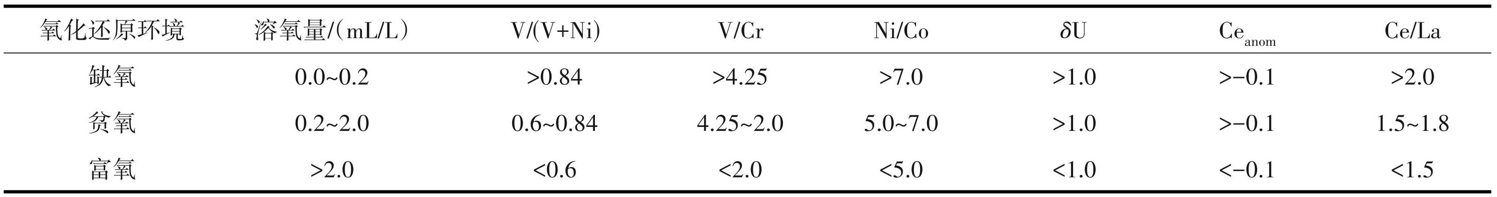 表5古氧化还原环境地球化学指标