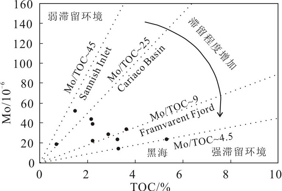 水体的滞留程度影响着水体的氧化还原状态,前人研究认为沉积物中 Mo/TOC值能够判别水体的滞留程度(李艳芳等,2015;吴育平等,2021)。在滞留性水体中,由于不能及时补给 Mo含量降低,随着水体滞留程度增大 Mo/TOC逐渐降低。陕南地区牛蹄塘组黑色岩系Mo/TOC值变化范围为4.01~35.34,平均 14.57,处于弱滞留—强滞留环境的过渡地带 (图8),更接近 Central Appalachian 盆地半滞留环境下形成的Ohio页岩(Mo/TOC为12~18)。