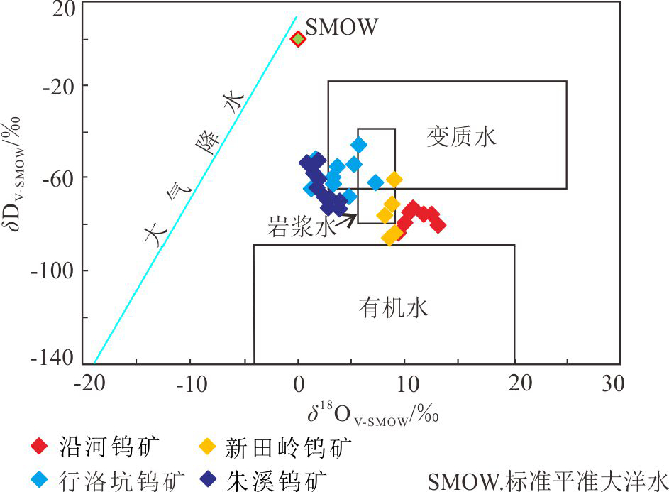 沿河钨矿床石英流体包裹体的 δDV-SMOW 为-74.365‰~-81.361‰、δ18Ov-SMOW 为 9.41‰~10.71‰,在δDV-SMOW-δ18Ov-SMOW判别图解中(图7),所有样品点均落在原始岩浆水的右侧或右下方,偏离原始岩浆水不远,同典型的与岩浆岩有关的钨矿床氢、氧同位素组成相似,如赣南朱溪超大型矽卡岩型钨矿的 δDV-SMOW 为-53‰~-87‰、δ18Ov-SMOW 为 2.58‰~5.68‰ (李岩等,2012),湘南新田岭大型矽卡岩型钨矿的δDV-SMOW为-97‰~-62‰、δ18Ov-SMOW为7.3‰~8.2‰(双燕等,2016),闽西行洛坑大型石英脉型钨矿的 δDV-SMOW 为-71‰~-56‰、δ18Ov-SMOW 为 11.9‰~12.3‰ (王辉等,2021)等,说明沿河钨矿成矿流体应主要来源于岩浆热液,晚期有大气降水的加入。