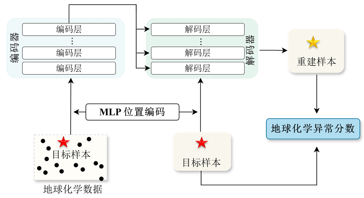 在此基础上,本文提出了一种基于 Transformer 架构的地球化学异常识别模型,以无监督方式学习目标样本的异常特征(图3)。该模型将地球化学样本表示为输入序列,其中目标样本为检测对象,剩余样本为上下文信息来源。为表征样本间的空间关系,所有样本通过多层感知器(MLP)生成可学习的位置编码。为了增强模型的泛化能力和数据多样性,模型对剩余样本进行了随机屏蔽处理。随后,这些样本被输入编码器,通过多层自注意力模块提取样本间的上下文特征,捕捉地球化学样本的空间分布和元素信息。解码器模块进一步接收编码特征与目标样本的位置编码,模拟目标样本与其他样本的交互过程,并最终生成目标样本的重构地球化学信号。依据自编码器原理(Xiong and Zuo, 2016),通过计算重构误差评估目标样本的异常分数,无需借助任何与矿化相关的标签数据。